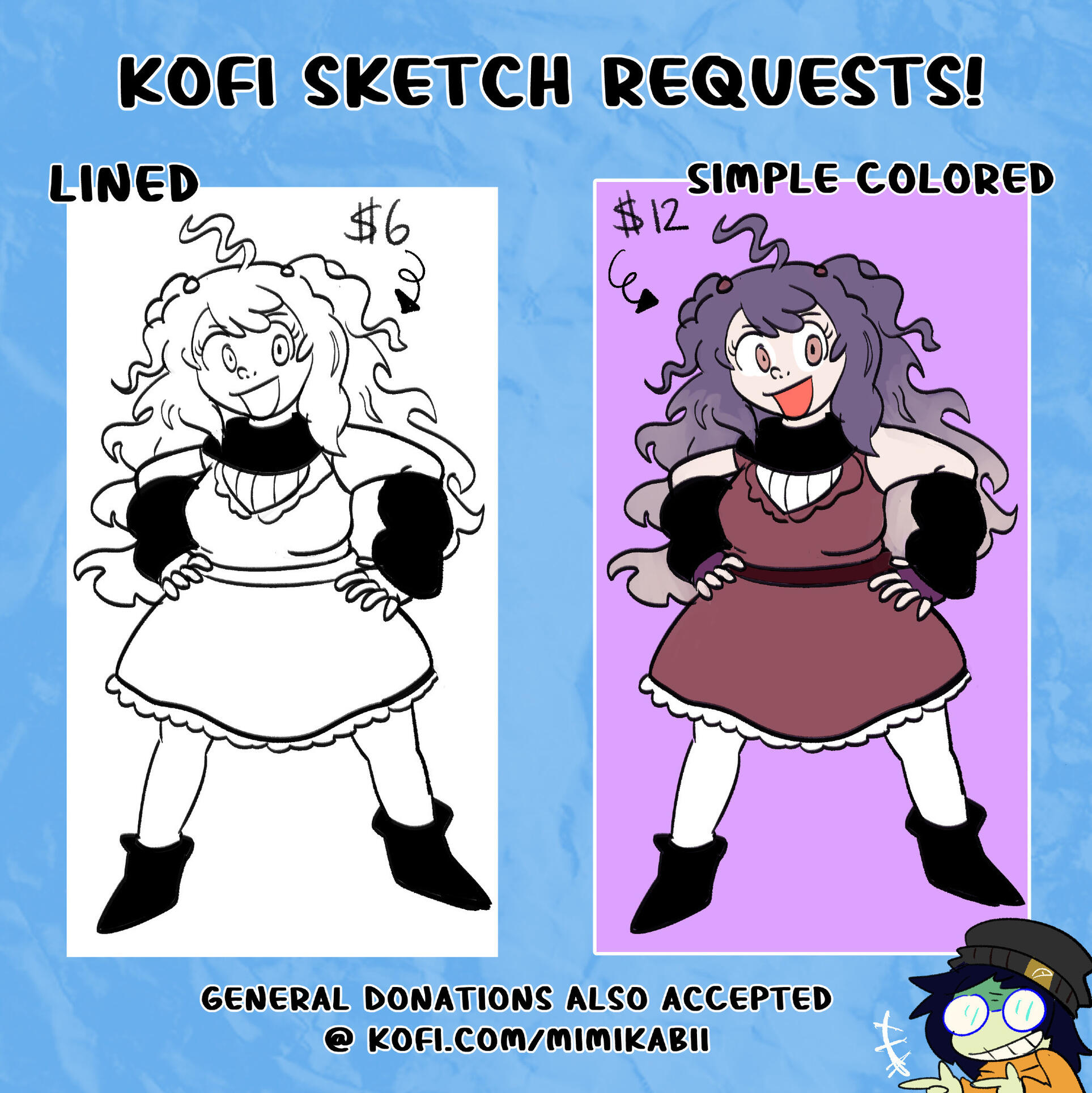 Two types of Sketches dependent on the donation received. No complex shading/lighting unless the donation is way more than required.FLAT PRICE OF $6 LINED AND $12 SIMPLY COLOREDThese are separate from general commissions and can be obtained through my Ko-Fi here!