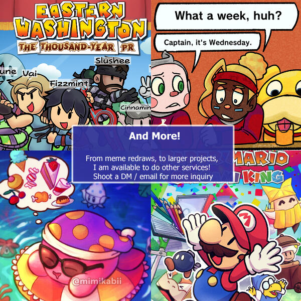 Don't see something you were hoping, don't worry!Want a simple GIF animation, or a comic strip, or a meme redraw? Banner? Larger Project? Something that doesn't fit those options? Feel free to email me and we can arrange a commission!Check out my Gallery to see more of what I can do!