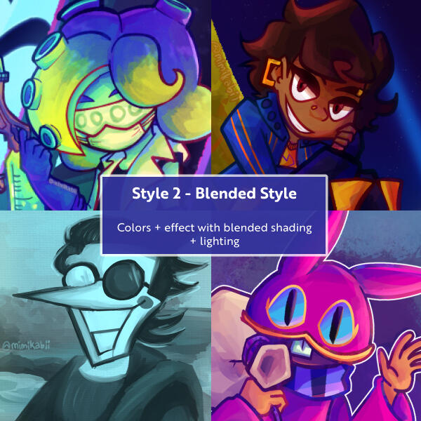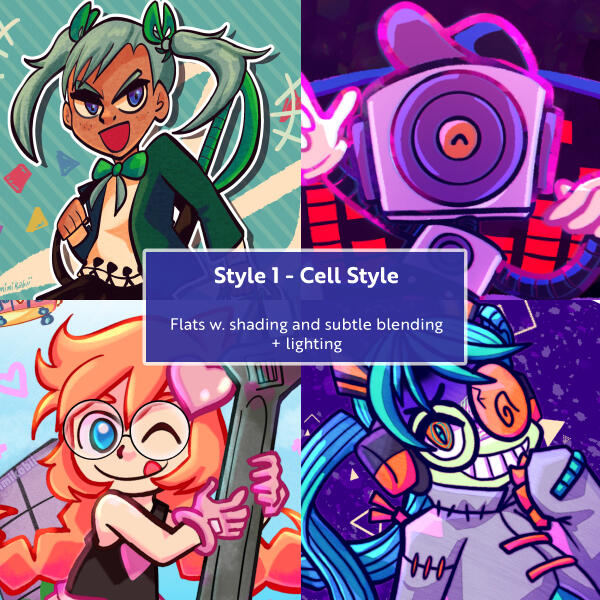 If you like art that pops out, this is for you! This style focuses on the bold, thick lineart with block-y shading and lighting. A realistic cartoony style, it adds a intricate and simplistic touch to characters.Flat $10 for a complex background (Not solid or pattern based)Complex designs may increase total price.Adding a character is +%50 the original price.
